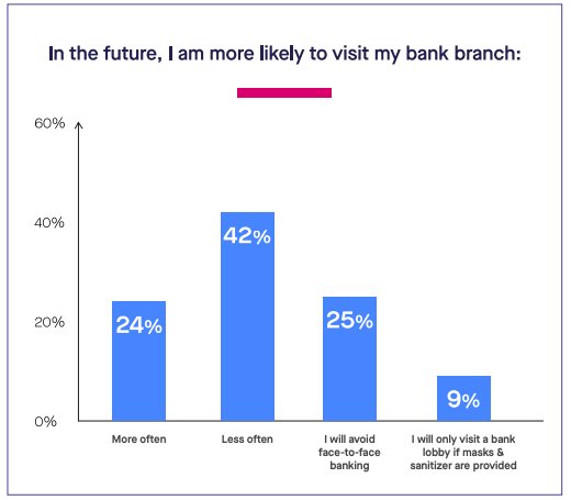 Branch banking continues to be impacted by consumers’ reluctance to leave the house. 76% of consumers plan to avoid or reduce visiting a bank branch in the future (to break it down, 42% will go less often, and 25% will avoid face-to-face banking altogether). Interestingly, safety measures seem to make little difference, with only 9% of consumers saying they will visit the branch if masks and hand sanitizers are available. Unfortunately, it gets worse. Not only do consumers prefer to bypass the branch visit––47% of consumers would be less likely to attend to a non-loan banking or financial task if it forced them to visit a branch. Furthermore, 33% of consumers would not take a loan if it required a branch visit. This should come as a shock given the desperation we see among consumers for new lines of credit, and the importance of lending in the banking industry. Yet, if we do not make lending seamless and if we require our customers to come into our branch, we will lose these opportunities.