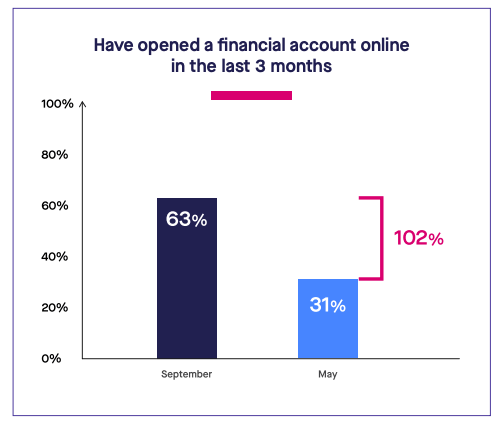 As of September 2020, more states were loosening coronavirus-related restrictions than tightening them. The coronavirus is no longer the mystery it was at the beginning of the outbreak, and we understand more about how to take precautions. And while a vaccine is still not available, we are likely closer to having one than we were months ago. Despite all this, consumers are significantly more likely to prefer digital, remote transactions now than they were when the outbreak was still fresh. 91% of consumers are willing to try a new digital app or website––an increase from 63% in May. And of customers who opened a financial account in the last three months, 63% of them completed the process online (compared to just 31% who did so in May). We can surmise that two things are at play here: First, banks have gotten better at serving customers digitally throughout the pandemic; there are more opportunities now for financial institutions to serve their customers digitally. Second, consumers have had more time to get comfortable with digital interactions throughout the pandemic. This may be especially true of nontypical digital users, such as senior citizens, who started to rely on digital channels to safeguard their health during the past half-year. Online and mobile banking no longer seem so intimidating; many now come to see digital channels as an essential convenience.